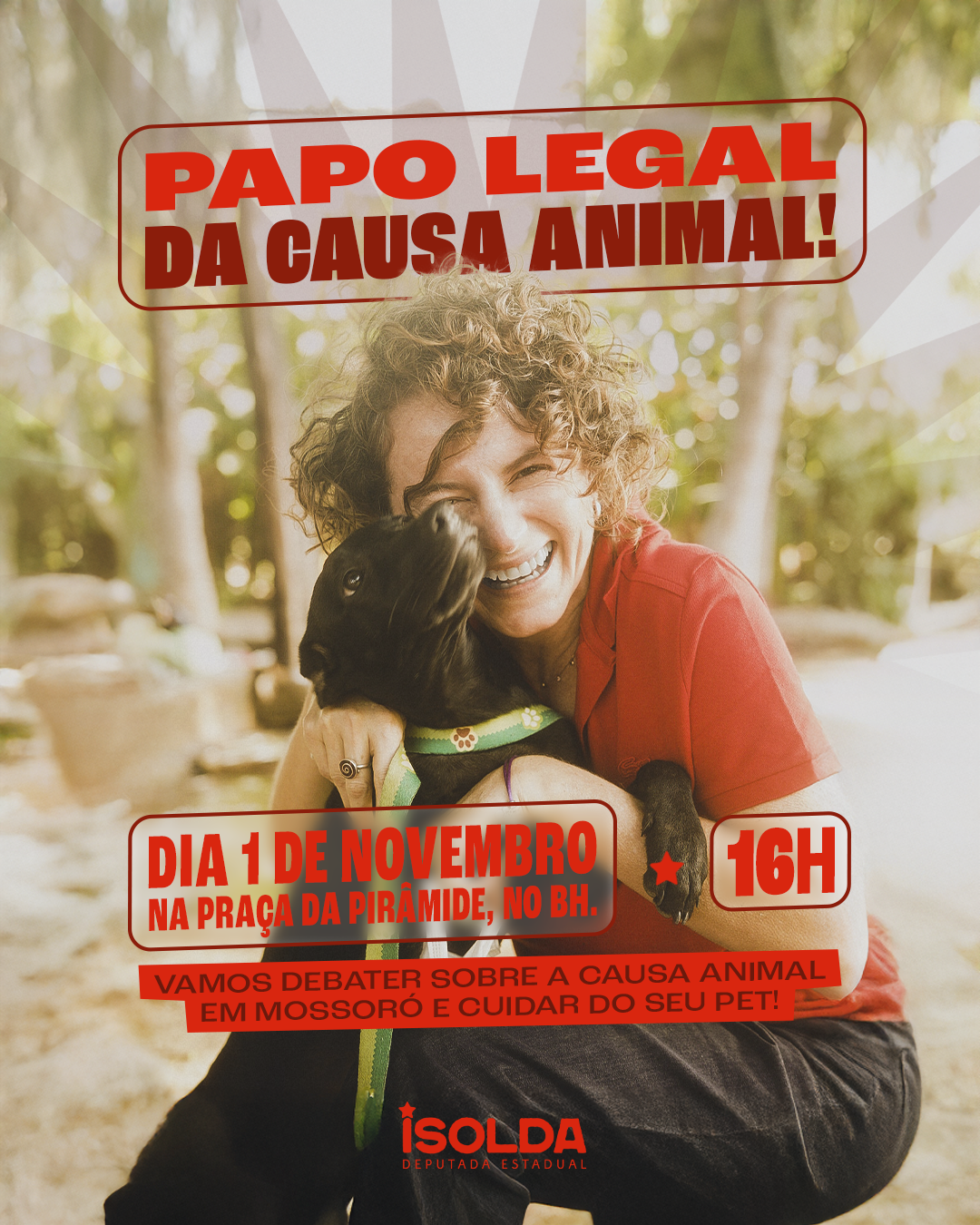 A deputada estadual Isolda Dantas realizará uma importante atividade da causa animal neste sábado (1) em Mossoró. O ‘Papo Legal’, como é chamada a atividade de caráter educativo realizada pelo mandato da deputada, terá como tema dessa vez a proteção animal e ambiental, e acontecerá às 16h, na Praça da Pirâmide, no bairro Belo Horizonte, em Mossoró.