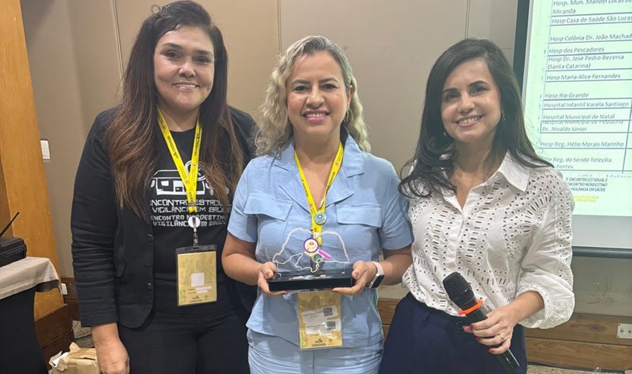 O Hospital Regional Tarcísio Maia esteve representado pela coordenadora do NVE, enfermeira Kalidyjamayra Oliveira R. Freitas, que foi agraciada por Deuma Maria Alves dos Santos, apoiadora da Renaveh e chefe de grupo, e Simona Alli Fernandes Farias que é responsável técnica pela Vigilância Epidemiológica da SESAP.
