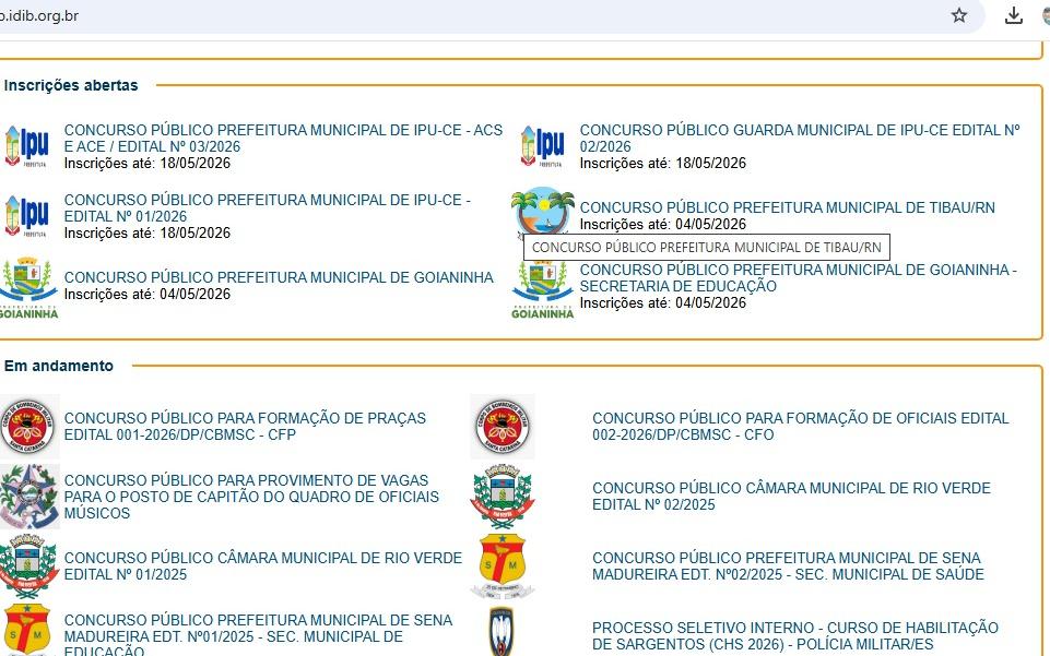 As inscrições devem ser realizadas até às 23h59 do dia 4 de maio de 2026, por meio do site do Instituto de Desenvolvimento Institucional Brasileiro https://idib.org.br/ A taxa de inscrição é de R$ 110 para cargos de nível médio e R$ 140 para nível superior, com pagamento permitido em até 24 horas após a emissão do boleto.